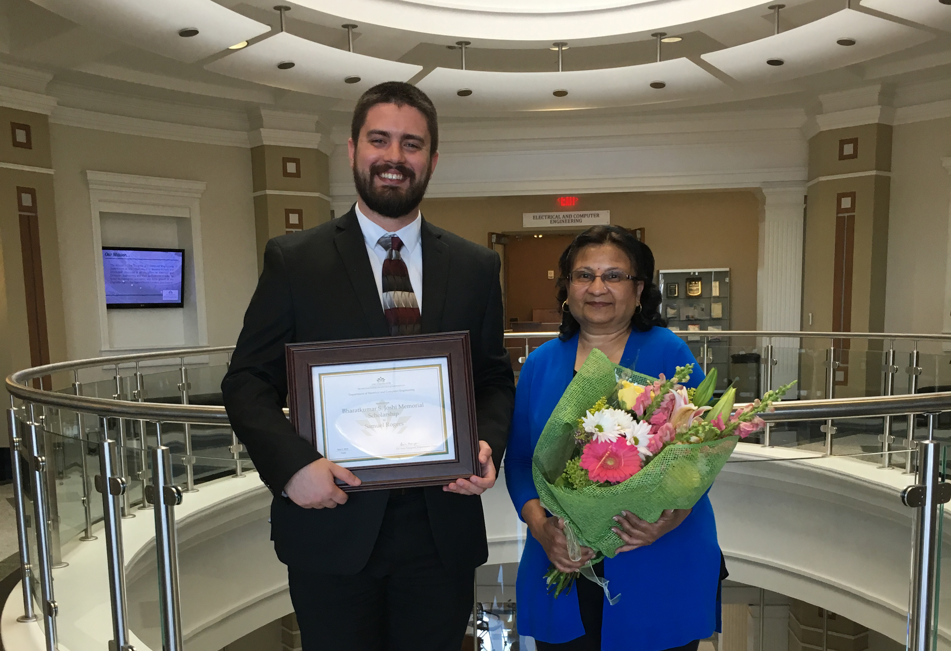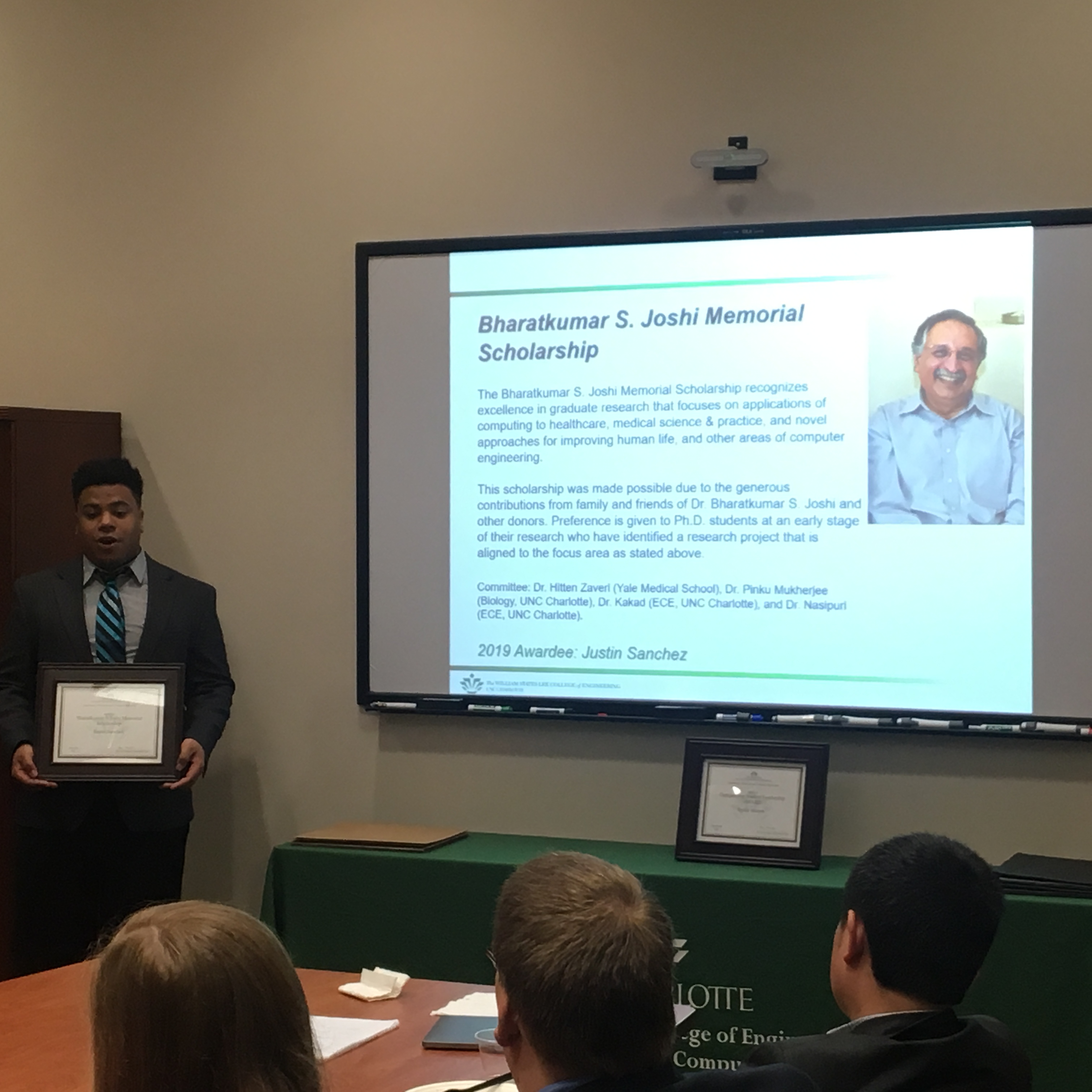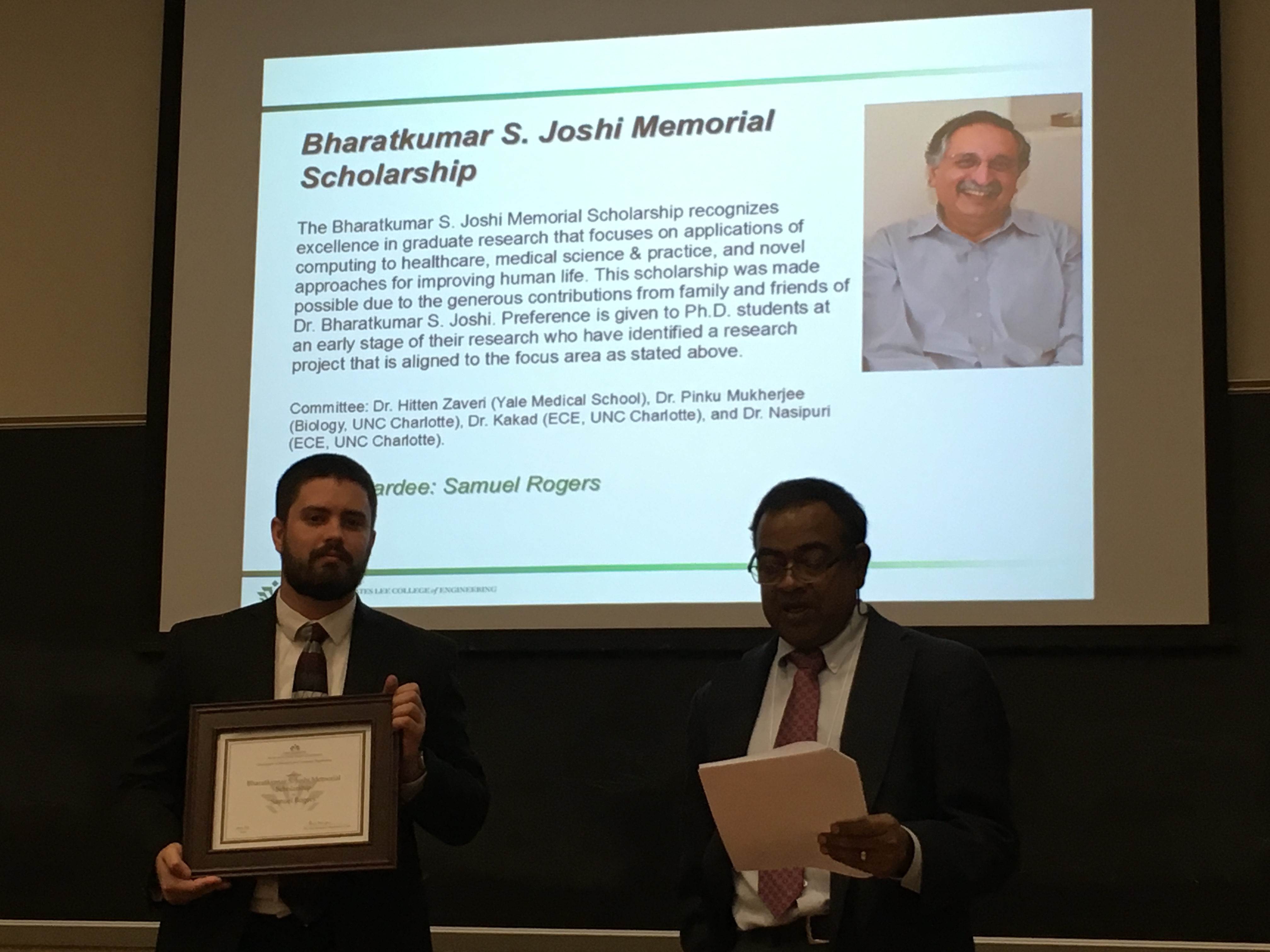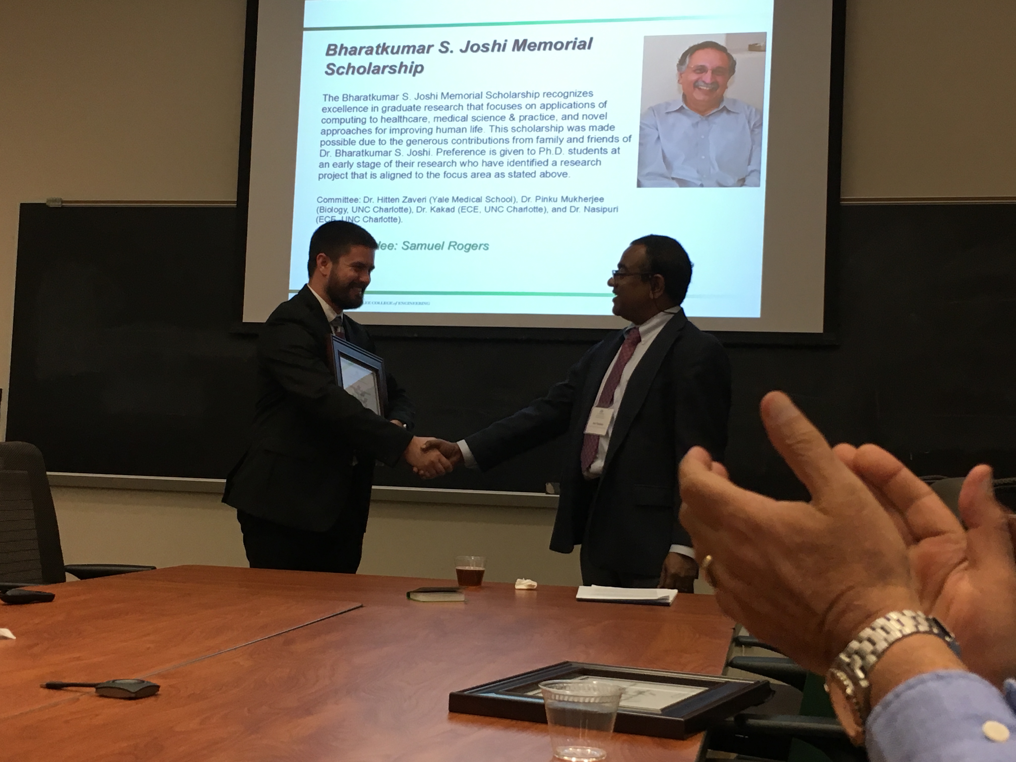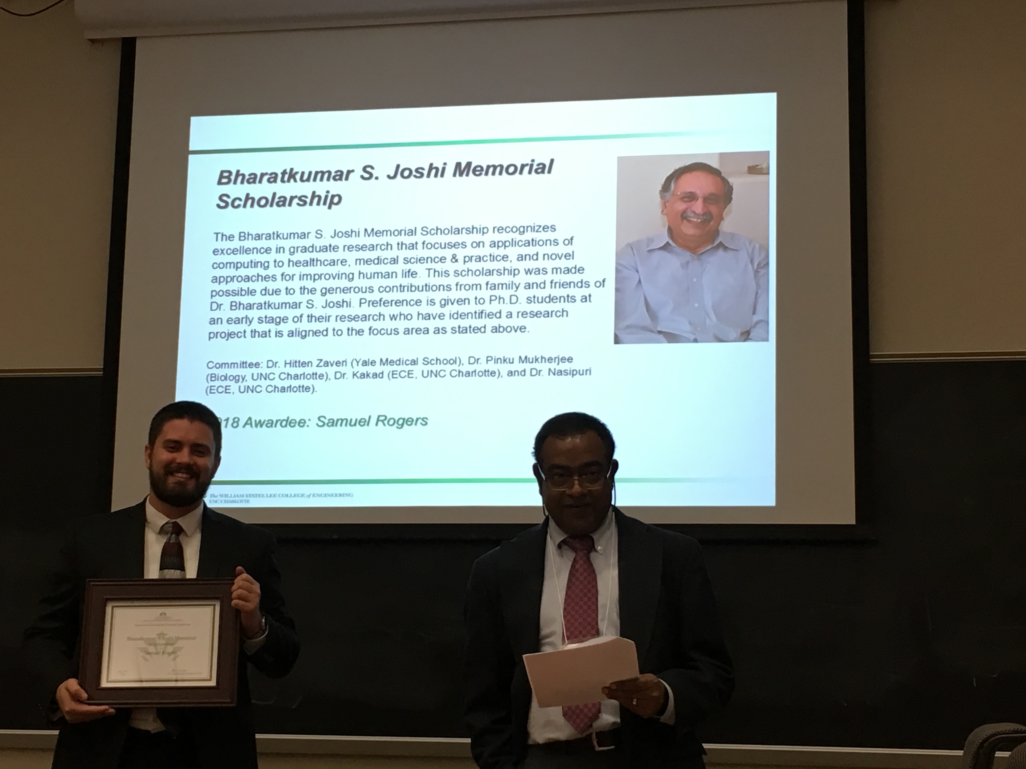 'The Bharatkumar S. Joshi Scholarship' for 2018 was awarded to Mr. Samuel Rogers for his academic record and research in healthcare computing and medical science on Wednesday, May 2, 2018.